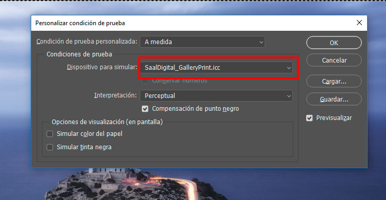Y en el cuadro de diálogo que aparece, simplemente seleccionamos en “Dispositivo para Simular” el Perfil ICC que hemos instalado previamente (si no te aparece es posible que necesites reiniciar Photoshop)