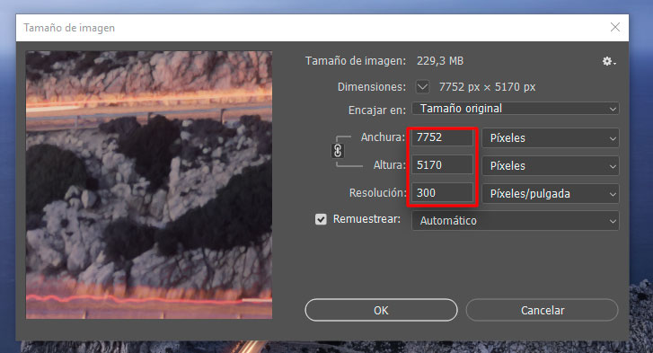 5. Cambio el tamaño de la fotografía que voy a imprimir para que la dimensión más corta sea igual que la del psd. (En este ejemplo tengo que aumentar mi fotografía pasando de 5170 px a 5229 px)