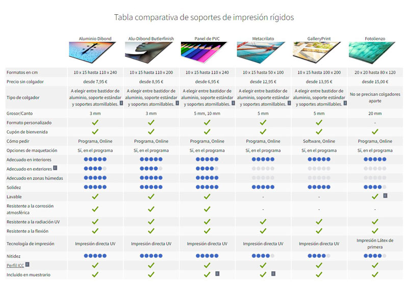 • Que pongan a tu disposición los perfiles ICC de las impresoras que utilicen (luego veremos qué es esto). Cuantos más perfiles ICC mejor, quiero decir, no será igual un perfil ICC para imprimir un cuadro en aluminio, que una foto en Papel Fine-Art.